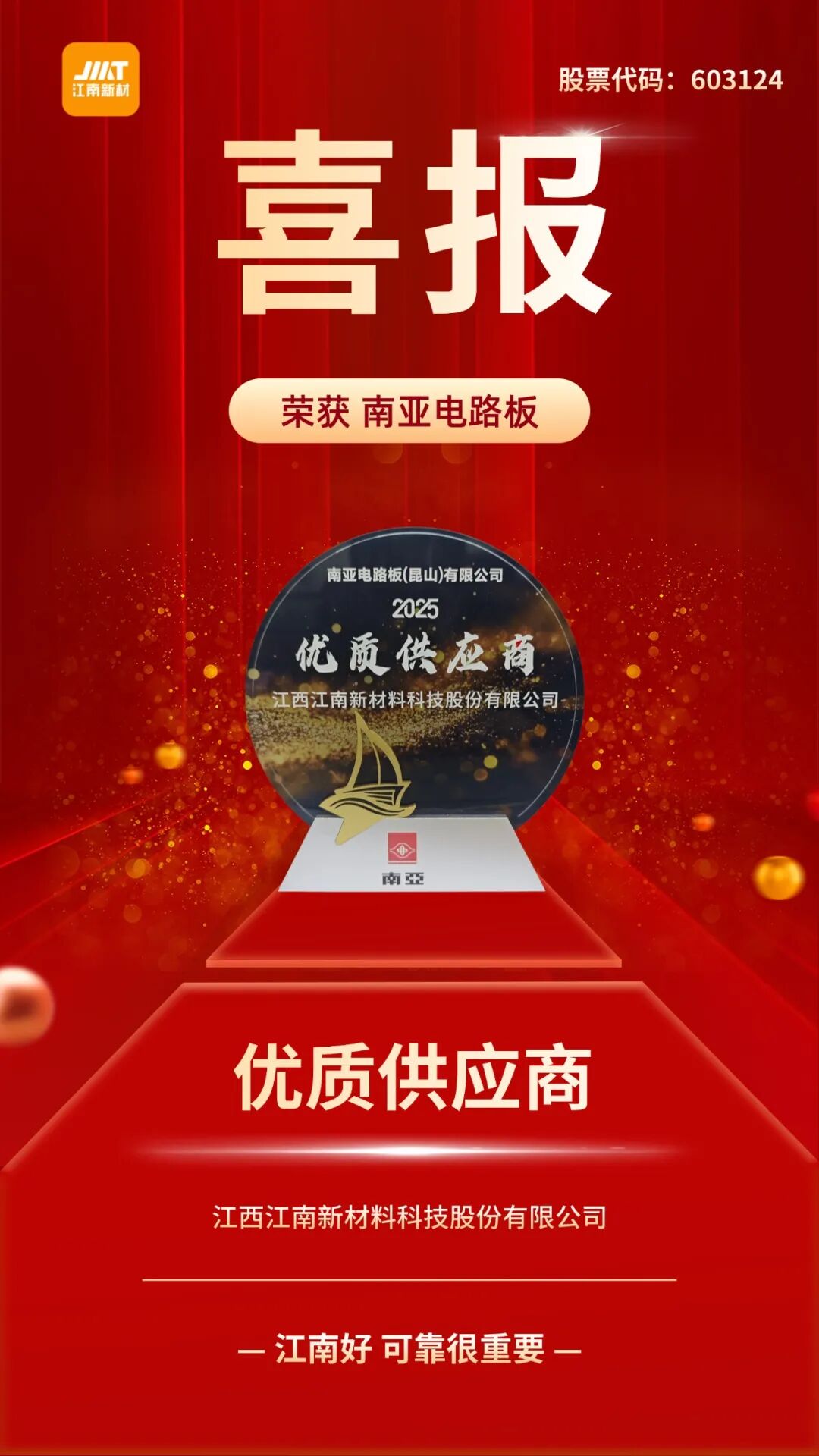 近日,南亚电路板 2025 年度供应链合作伙伴表彰仪式顺利举行,承蒙客户厚爱,江南新材荣获2025年度“优质供应商”。在此,我们向南亚电路板致以最诚挚的谢意,感恩这份认可与托付,也感恩长期以来的信任与同行。